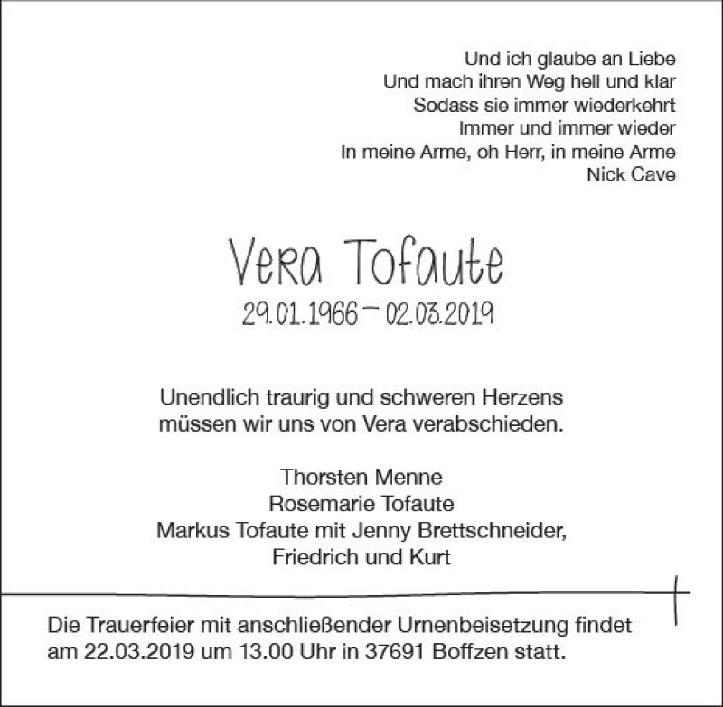 Hier finden Sie alle Traueranzeigen aus der Zeitung, die bisher für Vera Tofaute erschienen sind. Weitere Traueranzeigen, die in der Zeitung erscheinen, werden hier ebenfalls aufgelistet