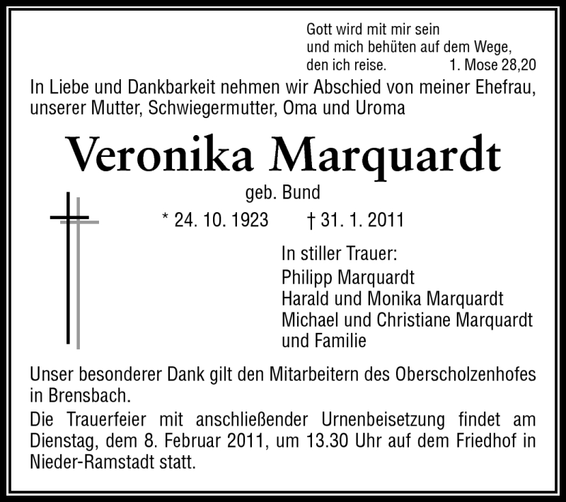Hier finden Sie alle Traueranzeigen aus der Zeitung, die bisher für Veronika Marquardt erschienen sind. Weitere Traueranzeigen, die in der Zeitung erscheinen, werden hier ebenfalls aufgelistet