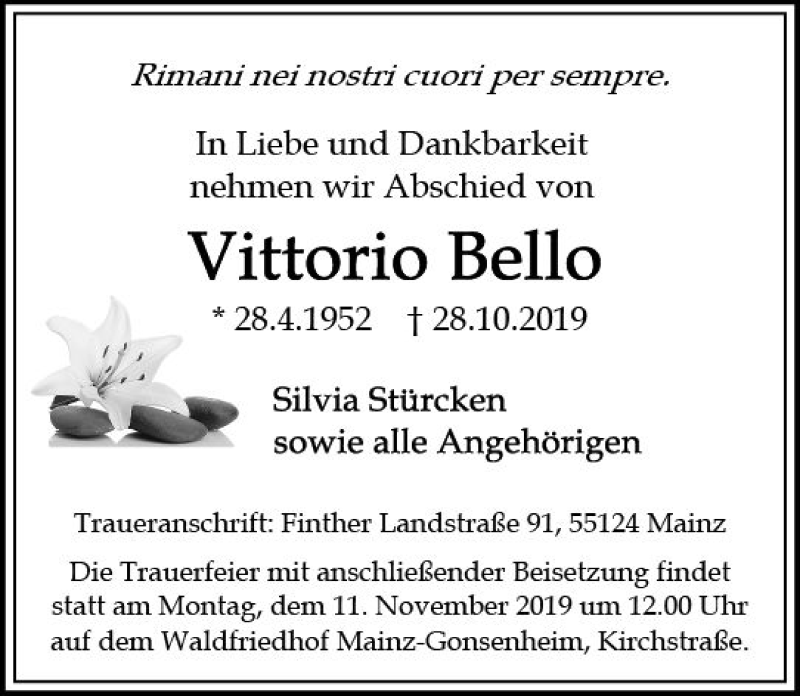 Hier finden Sie alle Traueranzeigen aus der Zeitung, die bisher für Vittorio Bello erschienen sind. Weitere Traueranzeigen, die in der Zeitung erscheinen, werden hier ebenfalls aufgelistet