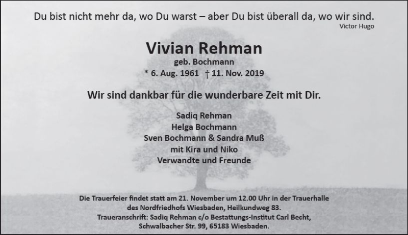 Hier finden Sie alle Traueranzeigen aus der Zeitung, die bisher für Vivian Rehman erschienen sind. Weitere Traueranzeigen, die in der Zeitung erscheinen, werden hier ebenfalls aufgelistet