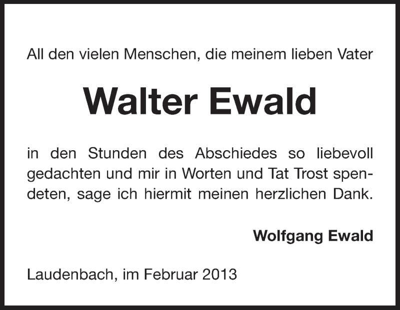 Hier finden Sie alle Traueranzeigen aus der Zeitung, die bisher für Walter Ewald erschienen sind. Weitere Traueranzeigen, die in der Zeitung erscheinen, werden hier ebenfalls aufgelistet