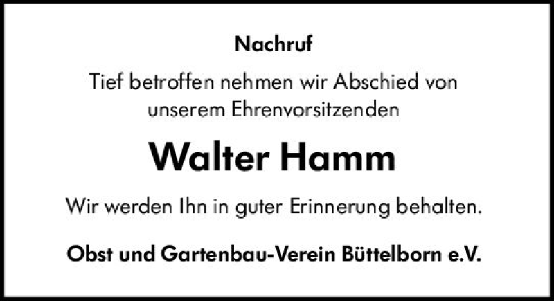 Hier finden Sie alle Traueranzeigen aus der Zeitung, die bisher für Walter Hamm erschienen sind. Weitere Traueranzeigen, die in der Zeitung erscheinen, werden hier ebenfalls aufgelistet