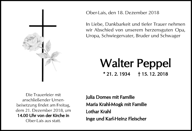 Hier finden Sie alle Traueranzeigen aus der Zeitung, die bisher für Walter Peppel erschienen sind. Weitere Traueranzeigen, die in der Zeitung erscheinen, werden hier ebenfalls aufgelistet