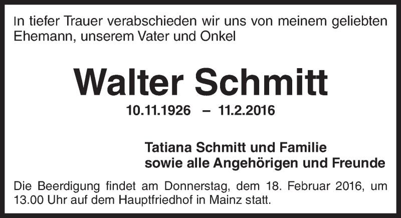 Hier finden Sie alle Traueranzeigen aus der Zeitung, die bisher für Walter Schmitt erschienen sind. Weitere Traueranzeigen, die in der Zeitung erscheinen, werden hier ebenfalls aufgelistet