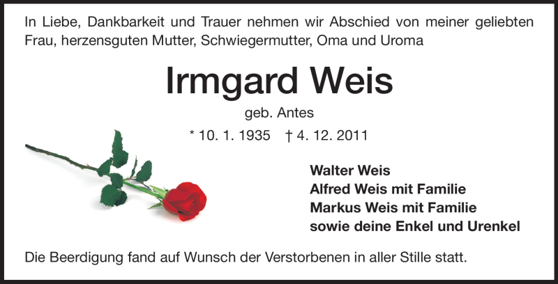 Hier finden Sie alle Traueranzeigen aus der Zeitung, die bisher für Walter Weis erschienen sind. Weitere Traueranzeigen, die in der Zeitung erscheinen, werden hier ebenfalls aufgelistet
