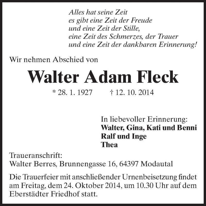 Hier finden Sie alle Traueranzeigen aus der Zeitung, die bisher für Walter Adam Fleck erschienen sind. Weitere Traueranzeigen, die in der Zeitung erscheinen, werden hier ebenfalls aufgelistet