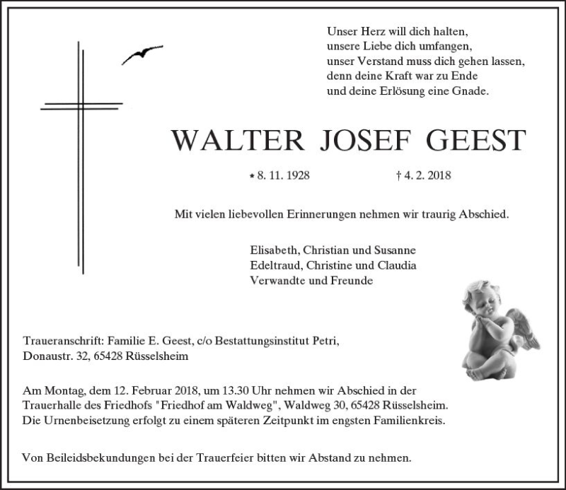 Hier finden Sie alle Traueranzeigen aus der Zeitung, die bisher für Walter Josef Geest erschienen sind. Weitere Traueranzeigen, die in der Zeitung erscheinen, werden hier ebenfalls aufgelistet