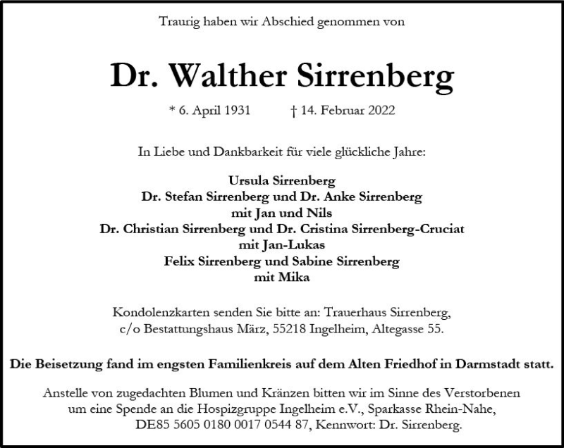 Hier finden Sie alle Traueranzeigen aus der Zeitung, die bisher für Walther Sirrenberg erschienen sind. Weitere Traueranzeigen, die in der Zeitung erscheinen, werden hier ebenfalls aufgelistet