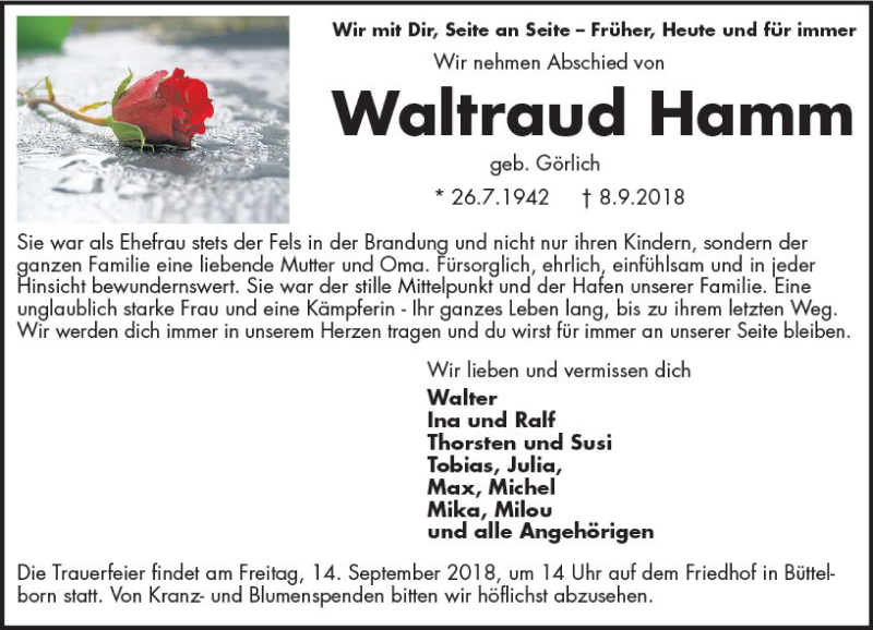 Hier finden Sie alle Traueranzeigen aus der Zeitung, die bisher für Waltraud Hamm erschienen sind. Weitere Traueranzeigen, die in der Zeitung erscheinen, werden hier ebenfalls aufgelistet