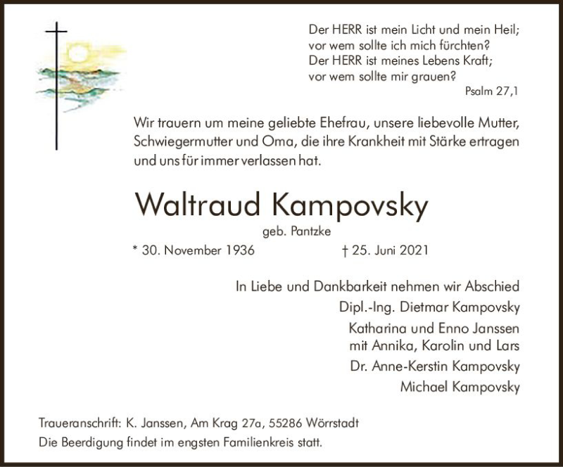 Hier finden Sie alle Traueranzeigen aus der Zeitung, die bisher für Waltraud Kampovsky erschienen sind. Weitere Traueranzeigen, die in der Zeitung erscheinen, werden hier ebenfalls aufgelistet