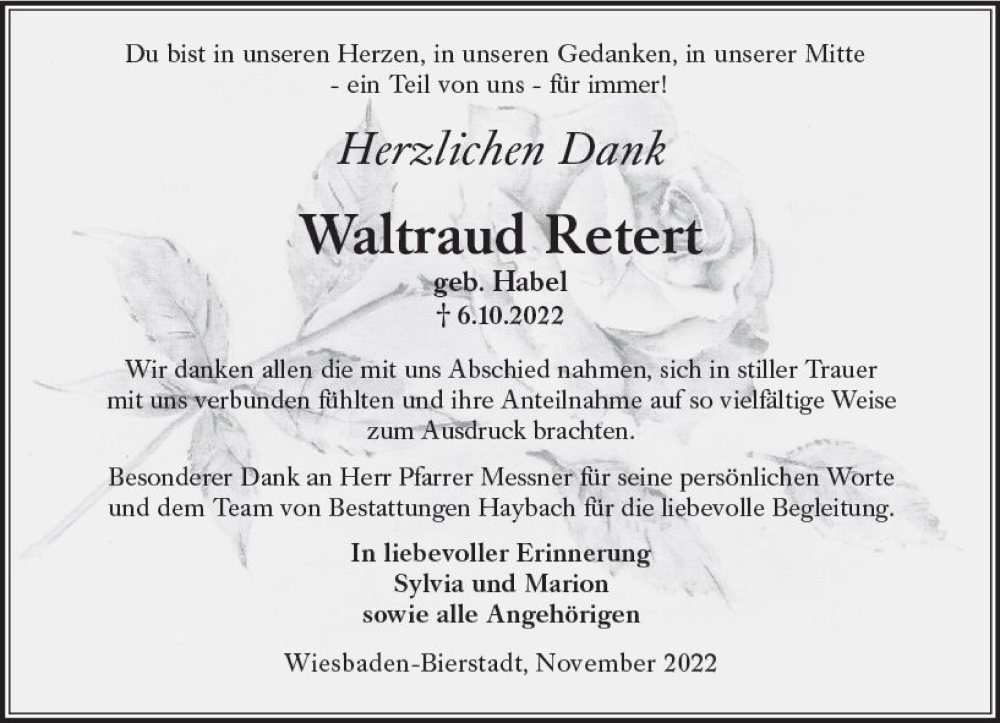 Hier finden Sie alle Traueranzeigen aus der Zeitung, die bisher für Waltraud Retert erschienen sind. Weitere Traueranzeigen, die in der Zeitung erscheinen, werden hier ebenfalls aufgelistet