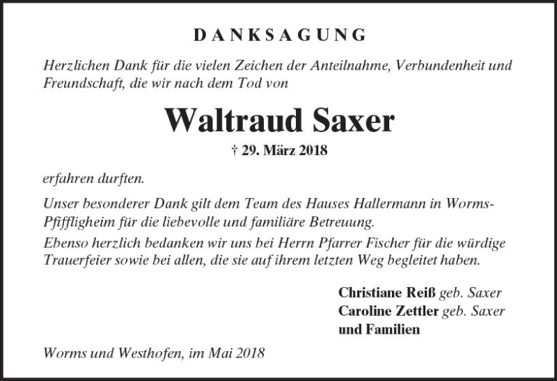 Hier finden Sie alle Traueranzeigen aus der Zeitung, die bisher für Waltraud Saxer erschienen sind. Weitere Traueranzeigen, die in der Zeitung erscheinen, werden hier ebenfalls aufgelistet