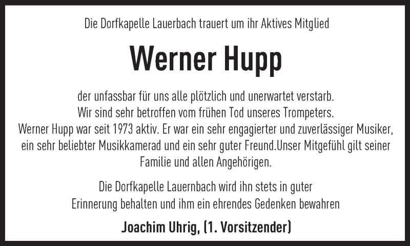 Hier finden Sie alle Traueranzeigen aus der Zeitung, die bisher für Werner Hupp erschienen sind. Weitere Traueranzeigen, die in der Zeitung erscheinen, werden hier ebenfalls aufgelistet