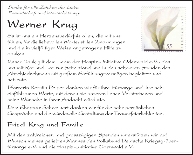 Hier finden Sie alle Traueranzeigen aus der Zeitung, die bisher für Werner Krug erschienen sind. Weitere Traueranzeigen, die in der Zeitung erscheinen, werden hier ebenfalls aufgelistet