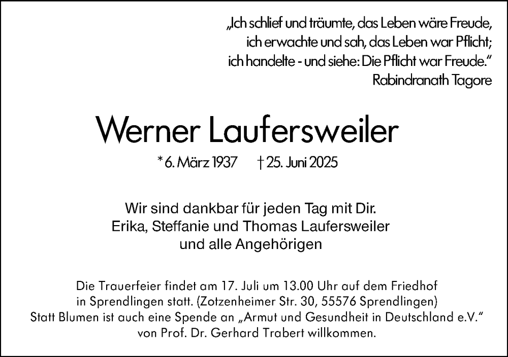 Hier finden Sie alle Traueranzeigen aus der Zeitung, die bisher für Werner Laufersweiler erschienen sind. Weitere Traueranzeigen, die in der Zeitung erscheinen, werden hier ebenfalls aufgelistet