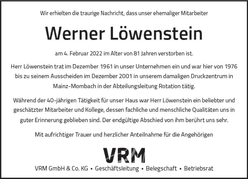 Hier finden Sie alle Traueranzeigen aus der Zeitung, die bisher für Werner Löwenstein erschienen sind. Weitere Traueranzeigen, die in der Zeitung erscheinen, werden hier ebenfalls aufgelistet