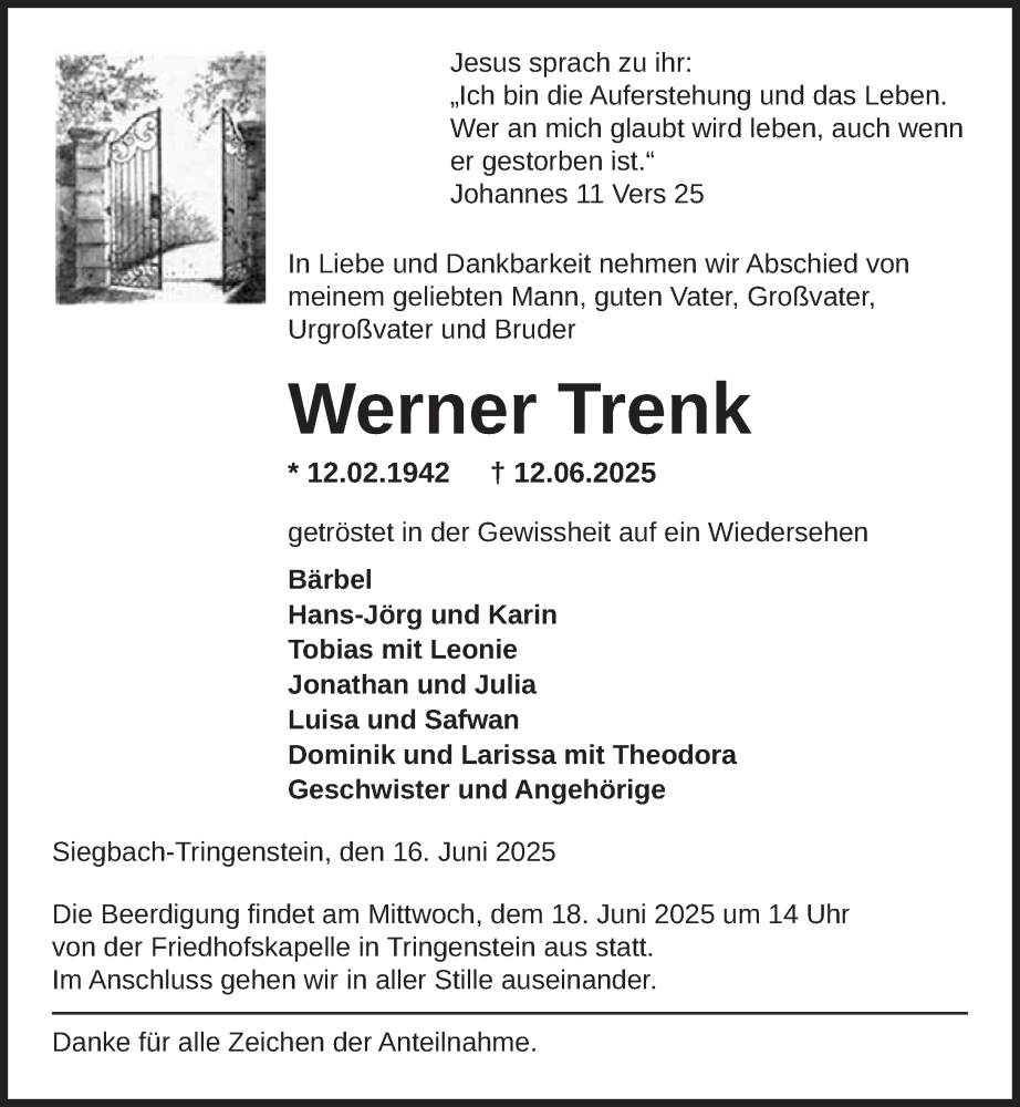 Hier finden Sie alle Traueranzeigen aus der Zeitung, die bisher für Werner Trenk erschienen sind. Weitere Traueranzeigen, die in der Zeitung erscheinen, werden hier ebenfalls aufgelistet