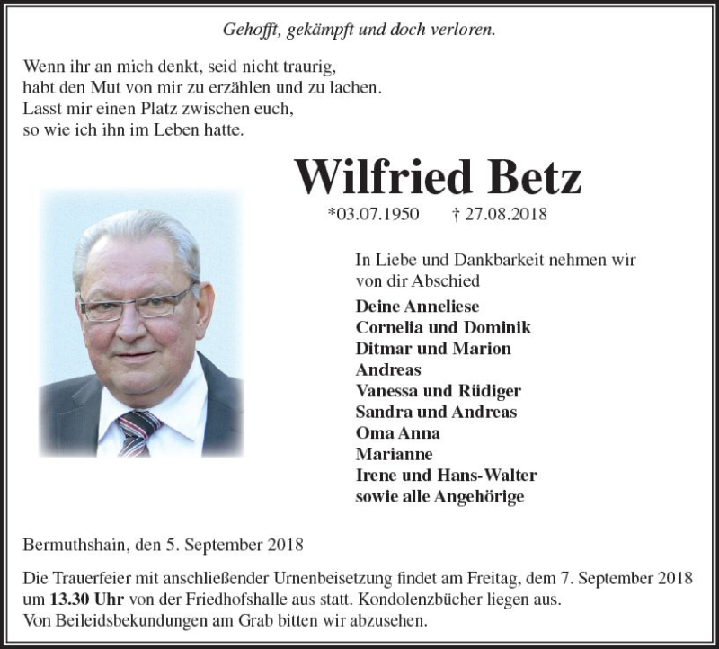 Hier finden Sie alle Traueranzeigen aus der Zeitung, die bisher für Wilfried Betz erschienen sind. Weitere Traueranzeigen, die in der Zeitung erscheinen, werden hier ebenfalls aufgelistet