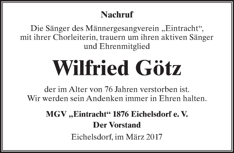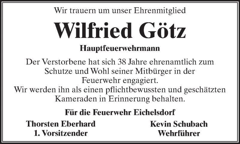 Hier finden Sie alle Traueranzeigen aus der Zeitung, die bisher für Wilfried Götz erschienen sind. Weitere Traueranzeigen, die in der Zeitung erscheinen, werden hier ebenfalls aufgelistet