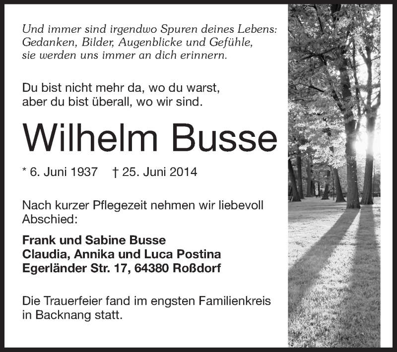 Hier finden Sie alle Traueranzeigen aus der Zeitung, die bisher für Wilhelm Busse erschienen sind. Weitere Traueranzeigen, die in der Zeitung erscheinen, werden hier ebenfalls aufgelistet