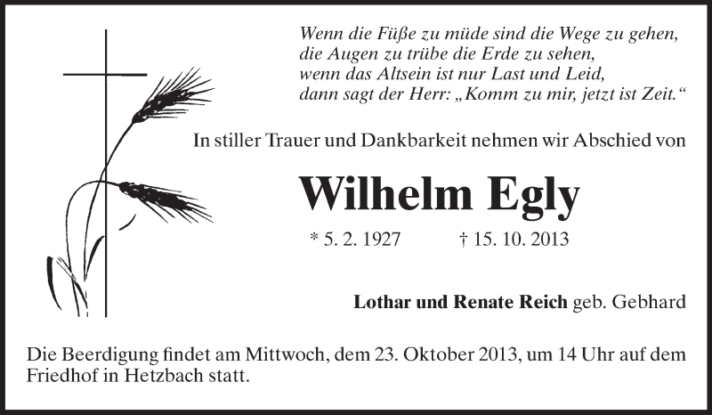 Hier finden Sie alle Traueranzeigen aus der Zeitung, die bisher für Wilhelm Egly erschienen sind. Weitere Traueranzeigen, die in der Zeitung erscheinen, werden hier ebenfalls aufgelistet