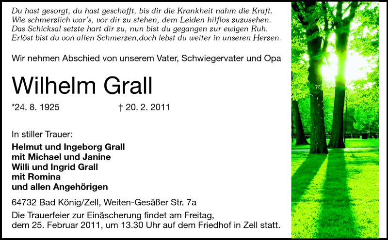 Hier finden Sie alle Traueranzeigen aus der Zeitung, die bisher für Wilhelm Grall erschienen sind. Weitere Traueranzeigen, die in der Zeitung erscheinen, werden hier ebenfalls aufgelistet