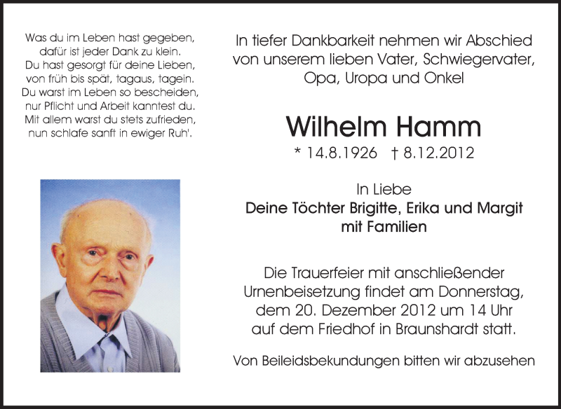 Hier finden Sie alle Traueranzeigen aus der Zeitung, die bisher für Wilhelm Hamm erschienen sind. Weitere Traueranzeigen, die in der Zeitung erscheinen, werden hier ebenfalls aufgelistet