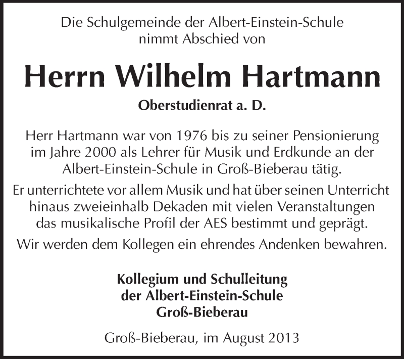 Hier finden Sie alle Traueranzeigen aus der Zeitung, die bisher für Wilhelm Hartmann erschienen sind. Weitere Traueranzeigen, die in der Zeitung erscheinen, werden hier ebenfalls aufgelistet