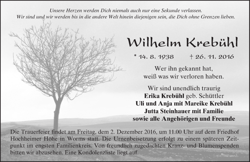 Hier finden Sie alle Traueranzeigen aus der Zeitung, die bisher für Wilhelm Krebühl erschienen sind. Weitere Traueranzeigen, die in der Zeitung erscheinen, werden hier ebenfalls aufgelistet