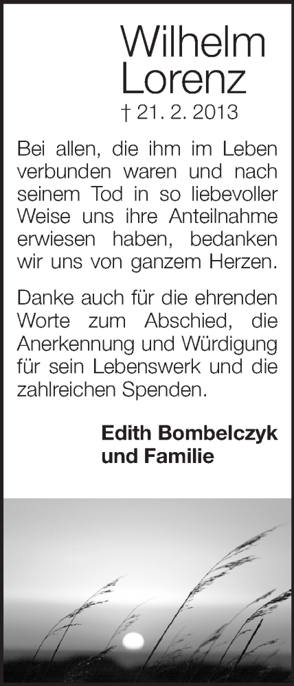 Hier finden Sie alle Traueranzeigen aus der Zeitung, die bisher für Wilhelm Lorenz erschienen sind. Weitere Traueranzeigen, die in der Zeitung erscheinen, werden hier ebenfalls aufgelistet