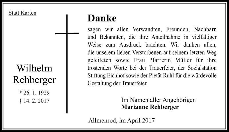 Hier finden Sie alle Traueranzeigen aus der Zeitung, die bisher für Wilhelm Rehberger erschienen sind. Weitere Traueranzeigen, die in der Zeitung erscheinen, werden hier ebenfalls aufgelistet