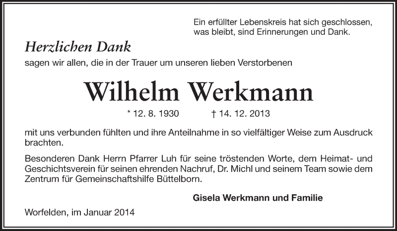 Hier finden Sie alle Traueranzeigen aus der Zeitung, die bisher für Wilhelm Werkmann erschienen sind. Weitere Traueranzeigen, die in der Zeitung erscheinen, werden hier ebenfalls aufgelistet