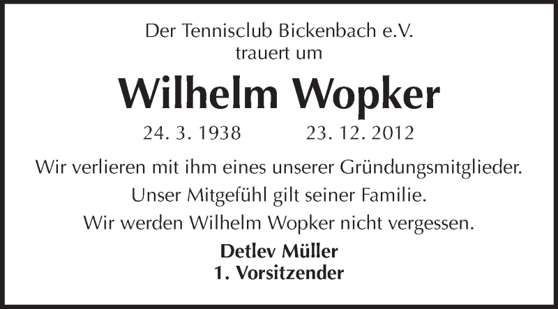 Hier finden Sie alle Traueranzeigen aus der Zeitung, die bisher für Wilhelm Wopker erschienen sind. Weitere Traueranzeigen, die in der Zeitung erscheinen, werden hier ebenfalls aufgelistet