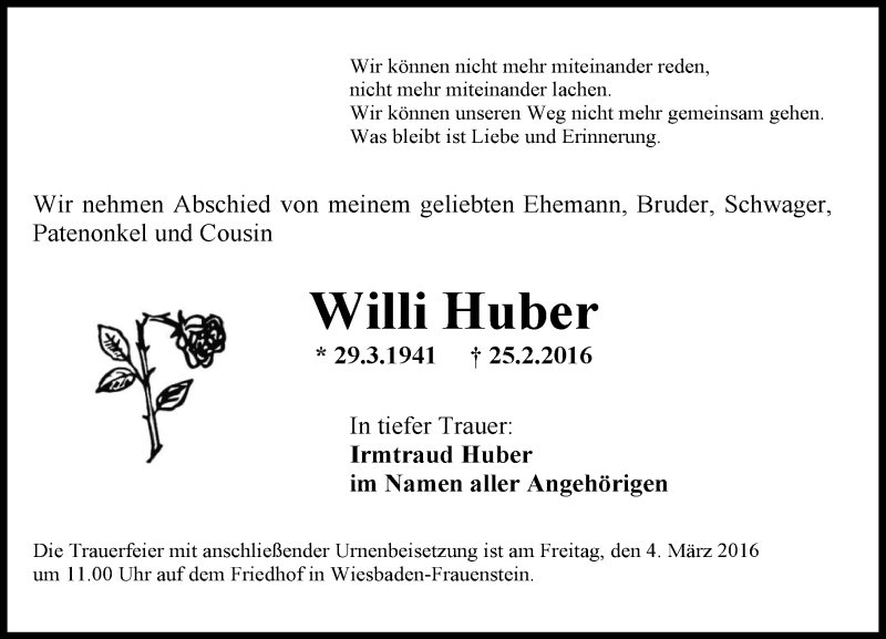 Hier finden Sie alle Traueranzeigen aus der Zeitung, die bisher für Willi Huber erschienen sind. Weitere Traueranzeigen, die in der Zeitung erscheinen, werden hier ebenfalls aufgelistet