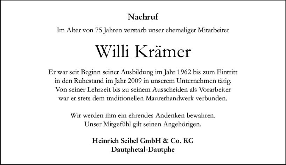 Hier finden Sie alle Traueranzeigen aus der Zeitung, die bisher für Willi Krämer erschienen sind. Weitere Traueranzeigen, die in der Zeitung erscheinen, werden hier ebenfalls aufgelistet