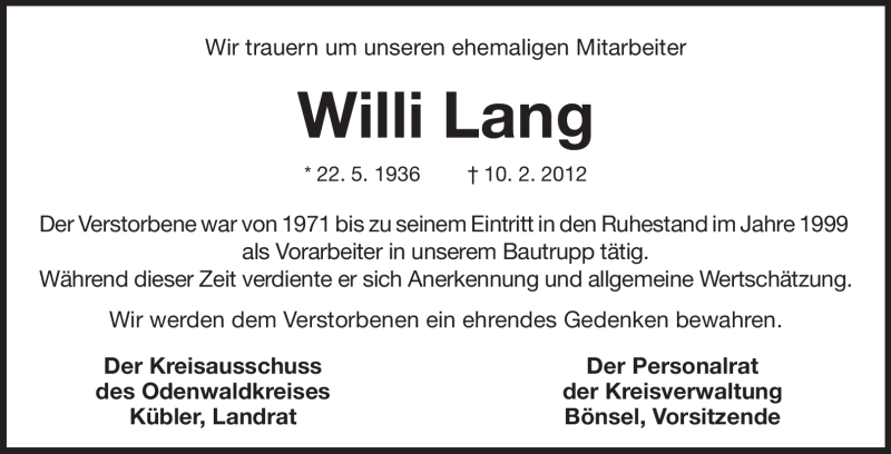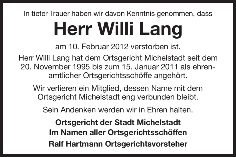 Hier finden Sie alle Traueranzeigen aus der Zeitung, die bisher für Willi Lang erschienen sind. Weitere Traueranzeigen, die in der Zeitung erscheinen, werden hier ebenfalls aufgelistet