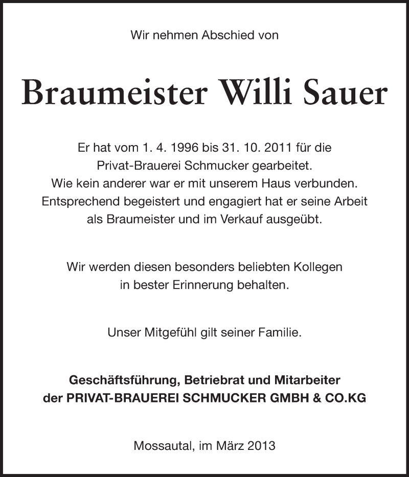 Hier finden Sie alle Traueranzeigen aus der Zeitung, die bisher für Willi Sauer erschienen sind. Weitere Traueranzeigen, die in der Zeitung erscheinen, werden hier ebenfalls aufgelistet