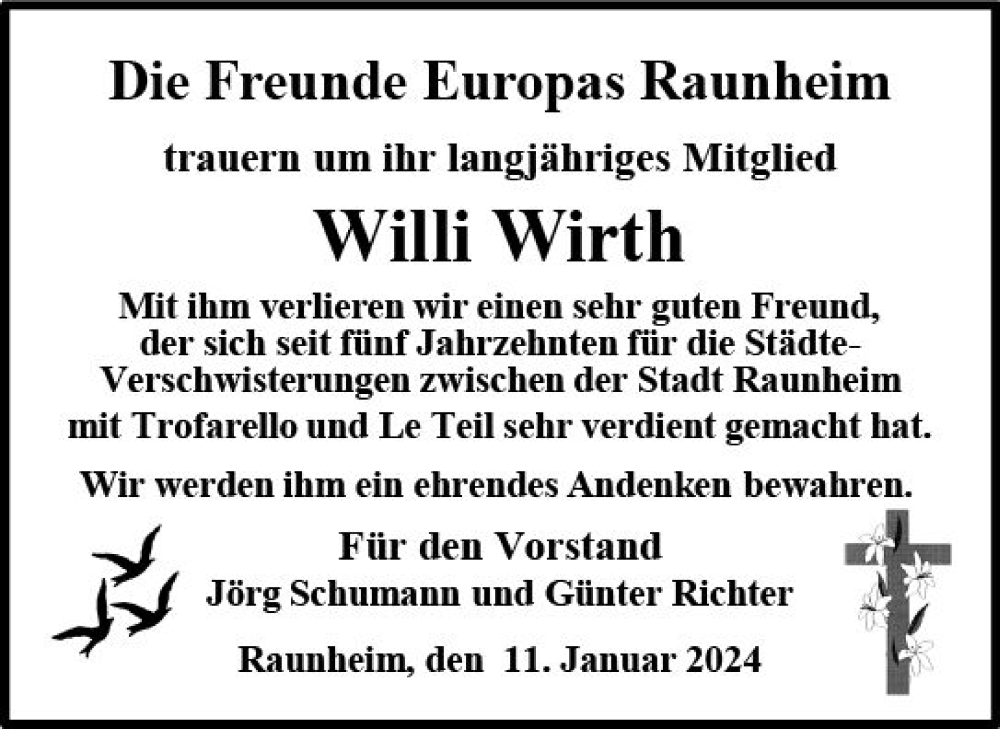 Hier finden Sie alle Traueranzeigen aus der Zeitung, die bisher für Willi Wirth erschienen sind. Weitere Traueranzeigen, die in der Zeitung erscheinen, werden hier ebenfalls aufgelistet