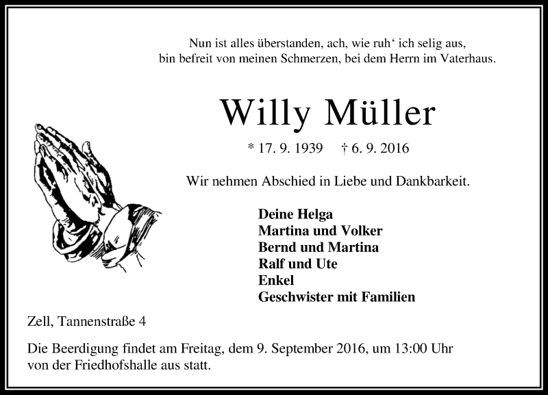 Hier finden Sie alle Traueranzeigen aus der Zeitung, die bisher für Willy Müller erschienen sind. Weitere Traueranzeigen, die in der Zeitung erscheinen, werden hier ebenfalls aufgelistet