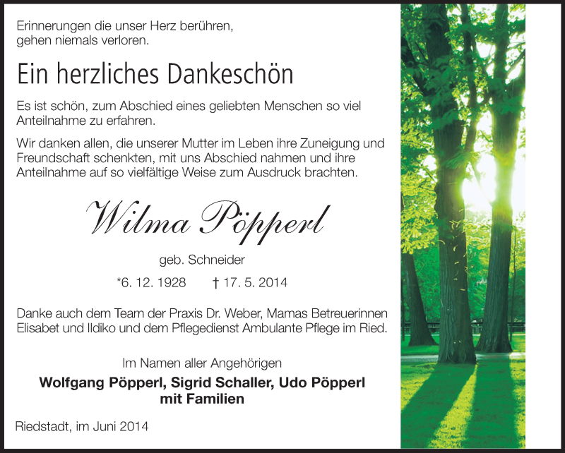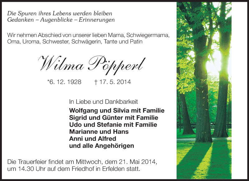 Hier finden Sie alle Traueranzeigen aus der Zeitung, die bisher für Wilma Pöpperl erschienen sind. Weitere Traueranzeigen, die in der Zeitung erscheinen, werden hier ebenfalls aufgelistet