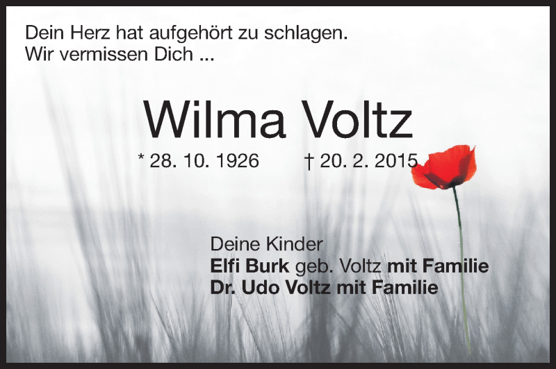Hier finden Sie alle Traueranzeigen aus der Zeitung, die bisher für Wilma Voltz erschienen sind. Weitere Traueranzeigen, die in der Zeitung erscheinen, werden hier ebenfalls aufgelistet
