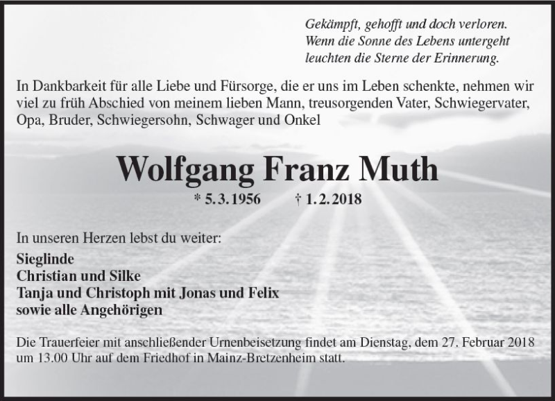 Hier finden Sie alle Traueranzeigen aus der Zeitung, die bisher für Wolfang Franz Muth erschienen sind. Weitere Traueranzeigen, die in der Zeitung erscheinen, werden hier ebenfalls aufgelistet