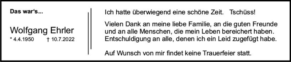 Hier finden Sie alle Traueranzeigen aus der Zeitung, die bisher für Wolfgang Ehrler erschienen sind. Weitere Traueranzeigen, die in der Zeitung erscheinen, werden hier ebenfalls aufgelistet