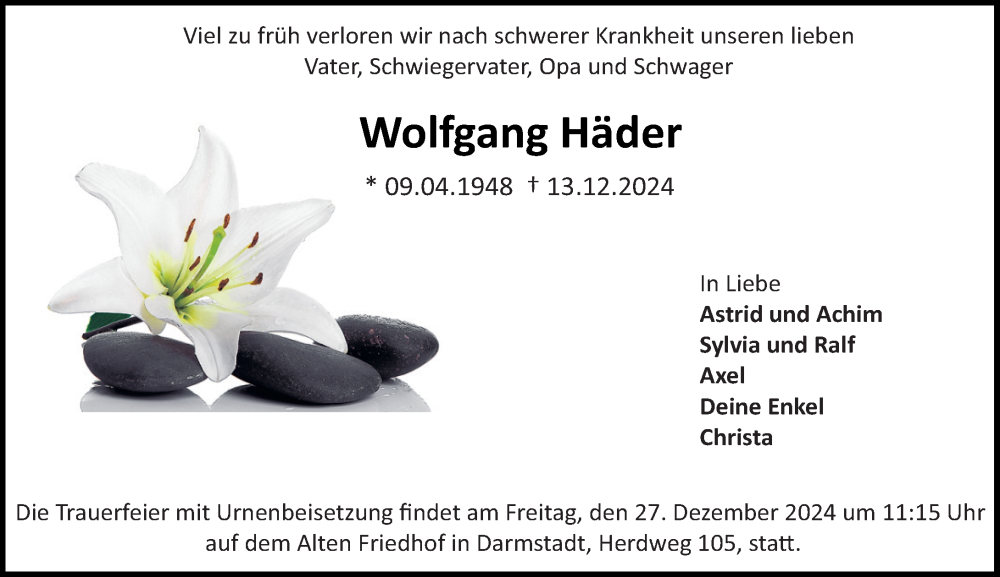 Hier finden Sie alle Traueranzeigen aus der Zeitung, die bisher für Wolfgang Häder erschienen sind. Weitere Traueranzeigen, die in der Zeitung erscheinen, werden hier ebenfalls aufgelistet