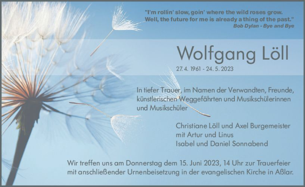 Hier finden Sie alle Traueranzeigen aus der Zeitung, die bisher für Wolfgang Löll erschienen sind. Weitere Traueranzeigen, die in der Zeitung erscheinen, werden hier ebenfalls aufgelistet