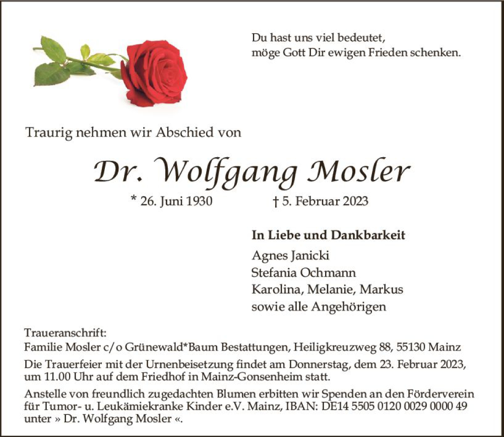 Hier finden Sie alle Traueranzeigen aus der Zeitung, die bisher für Wolfgang Mosler erschienen sind. Weitere Traueranzeigen, die in der Zeitung erscheinen, werden hier ebenfalls aufgelistet