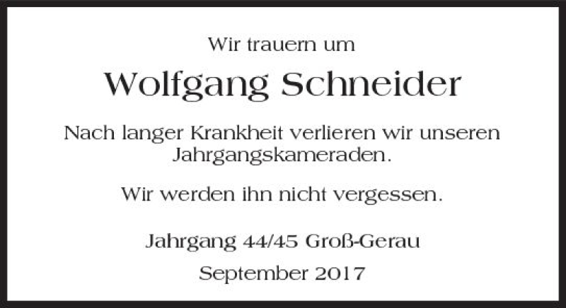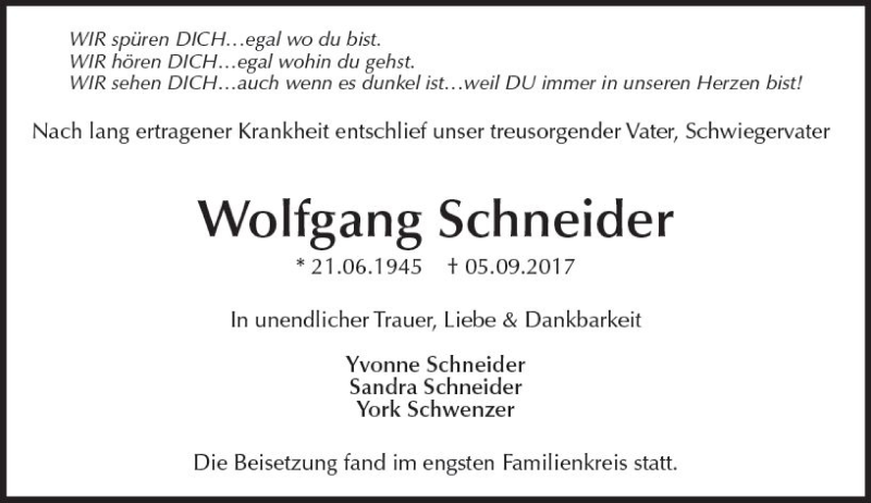 Hier finden Sie alle Traueranzeigen aus der Zeitung, die bisher für Wolfgang Schneider erschienen sind. Weitere Traueranzeigen, die in der Zeitung erscheinen, werden hier ebenfalls aufgelistet
