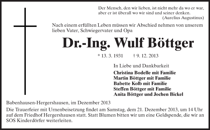 Hier finden Sie alle Traueranzeigen aus der Zeitung, die bisher für Wulf Böttger erschienen sind. Weitere Traueranzeigen, die in der Zeitung erscheinen, werden hier ebenfalls aufgelistet