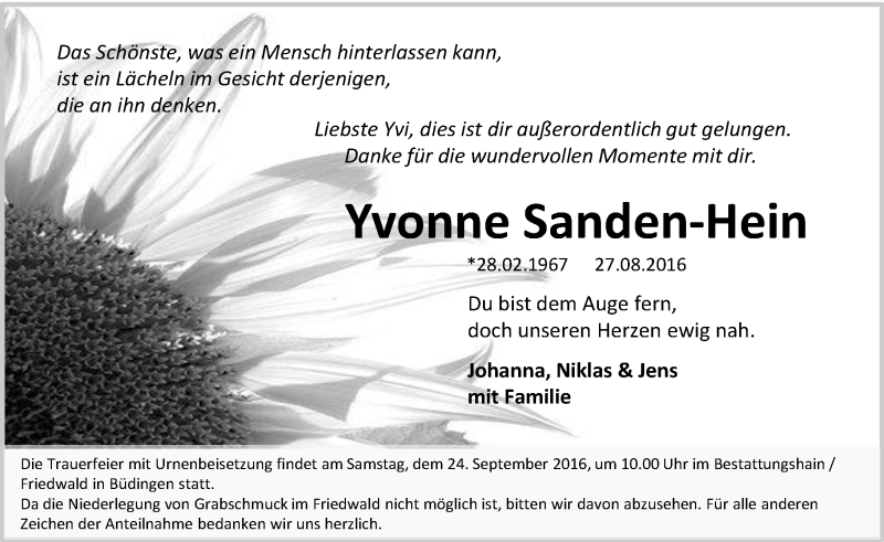 Hier finden Sie alle Traueranzeigen aus der Zeitung, die bisher für Yvonne Sanden-Hein erschienen sind. Weitere Traueranzeigen, die in der Zeitung erscheinen, werden hier ebenfalls aufgelistet